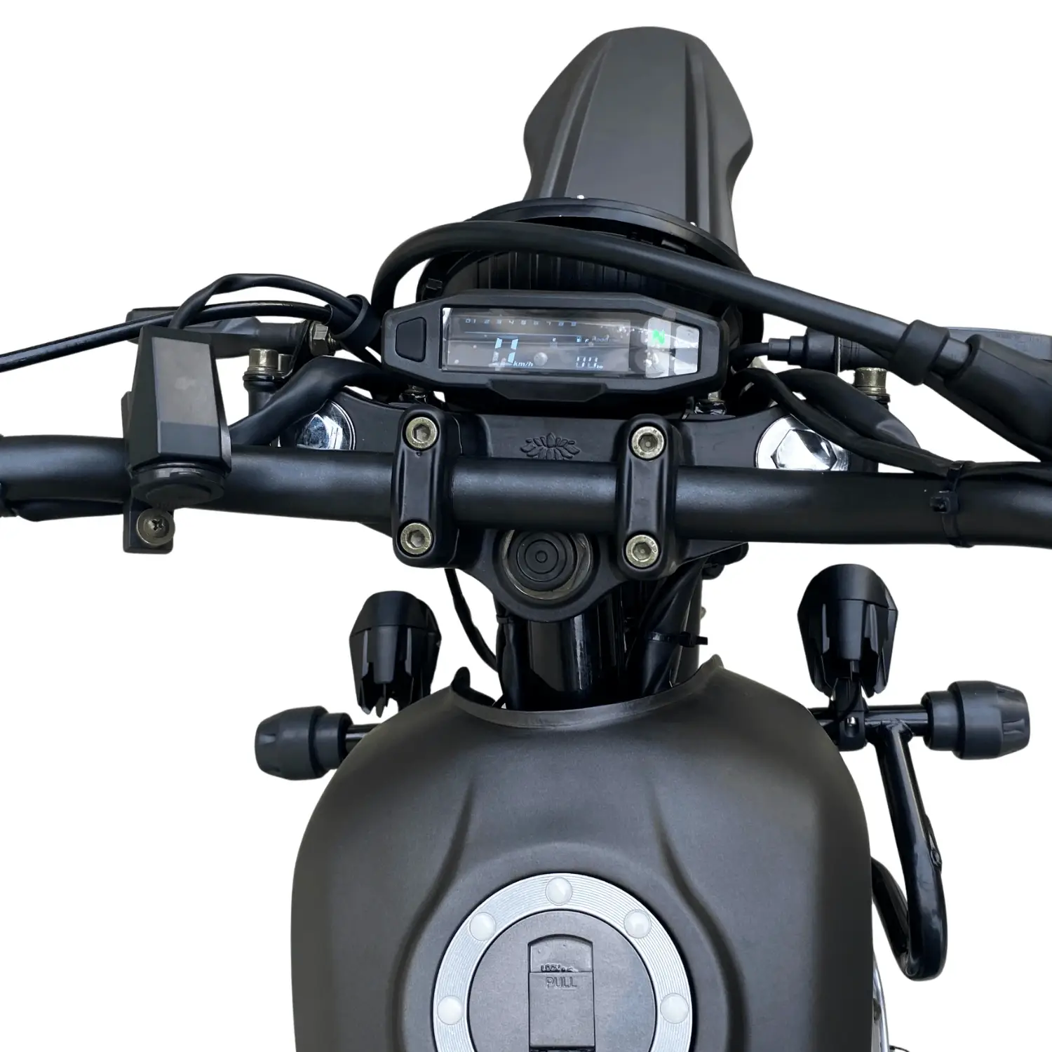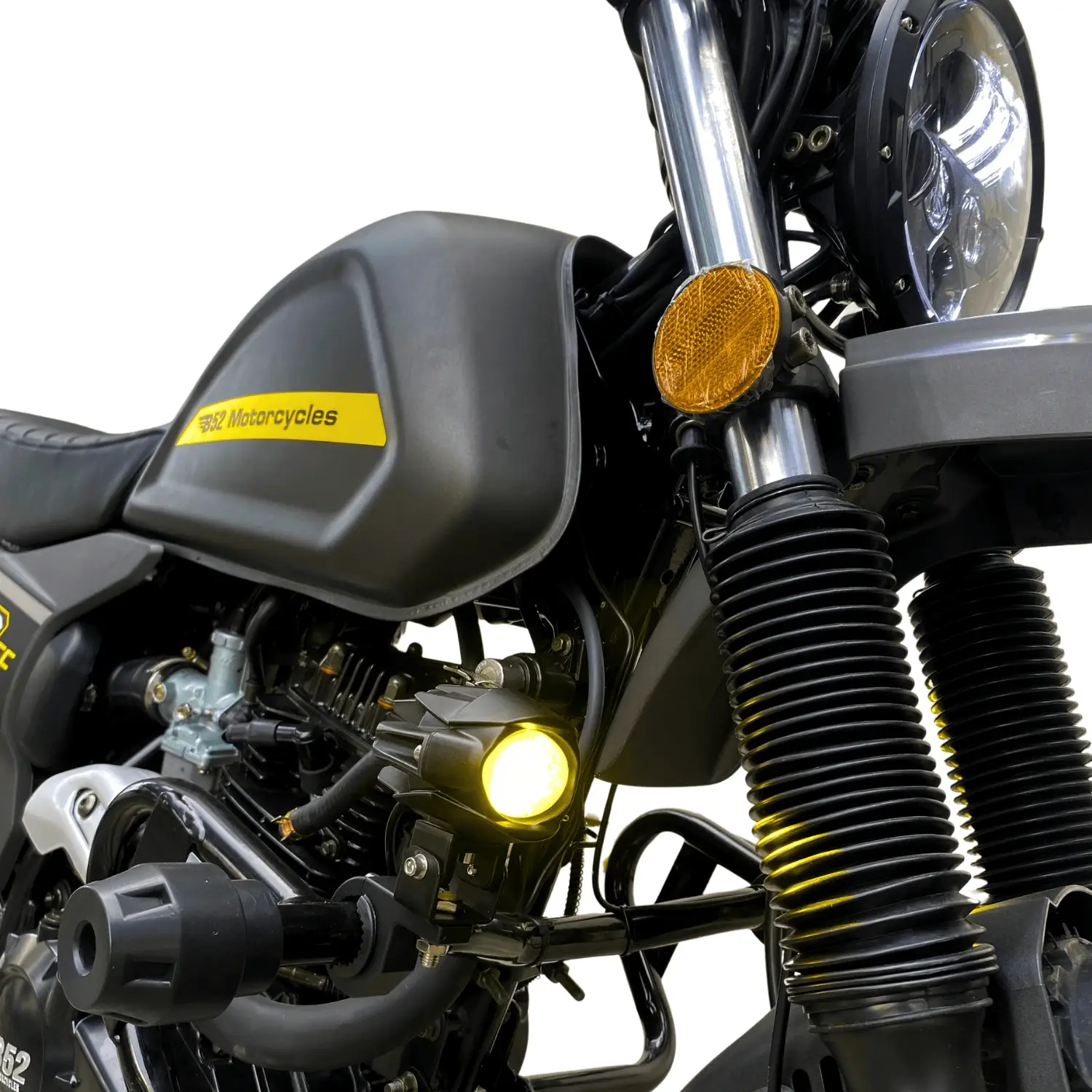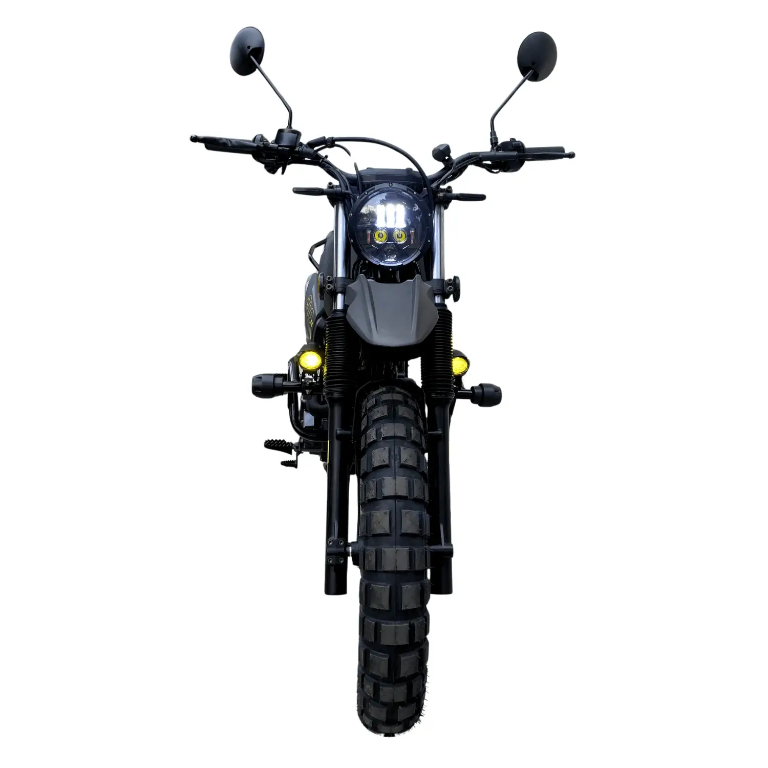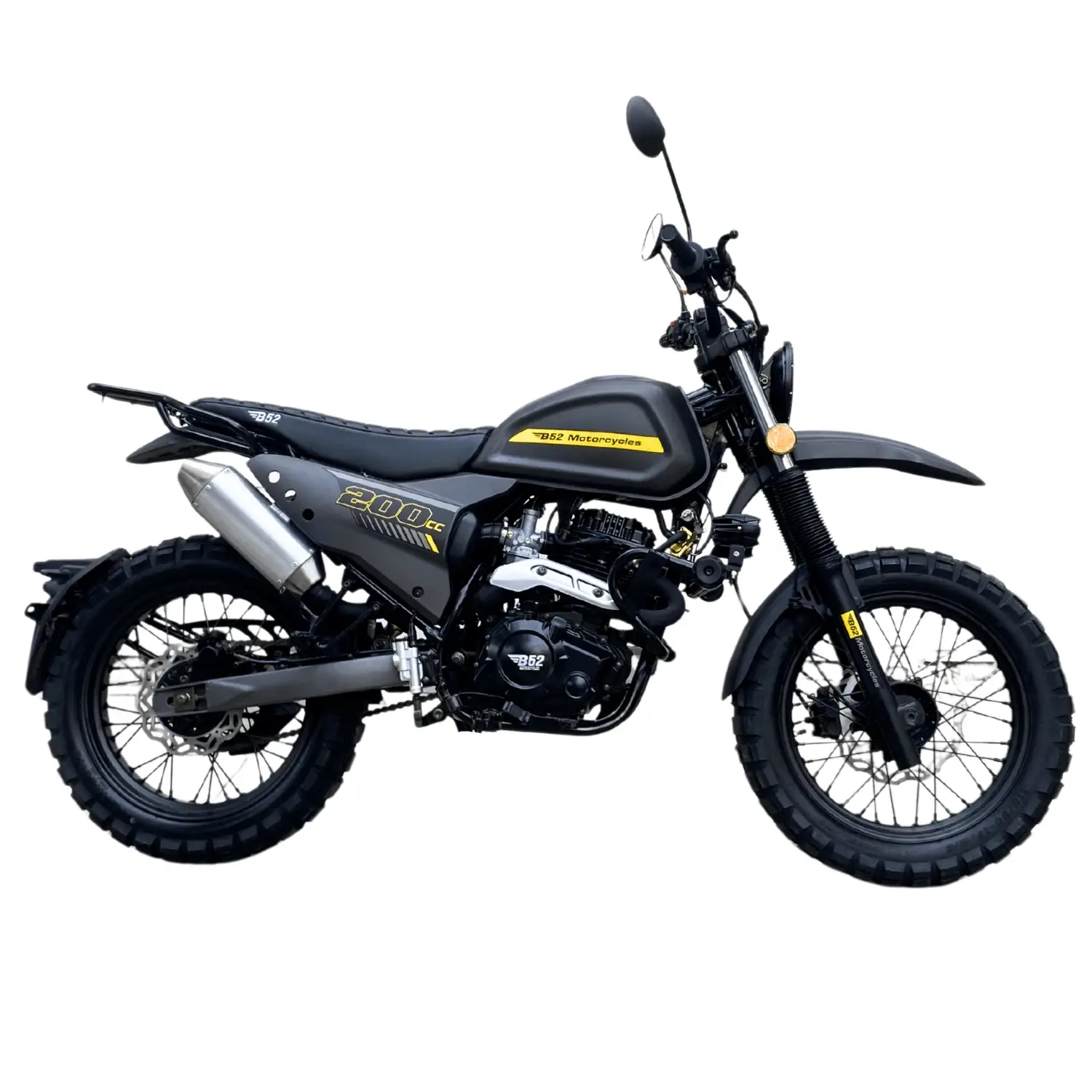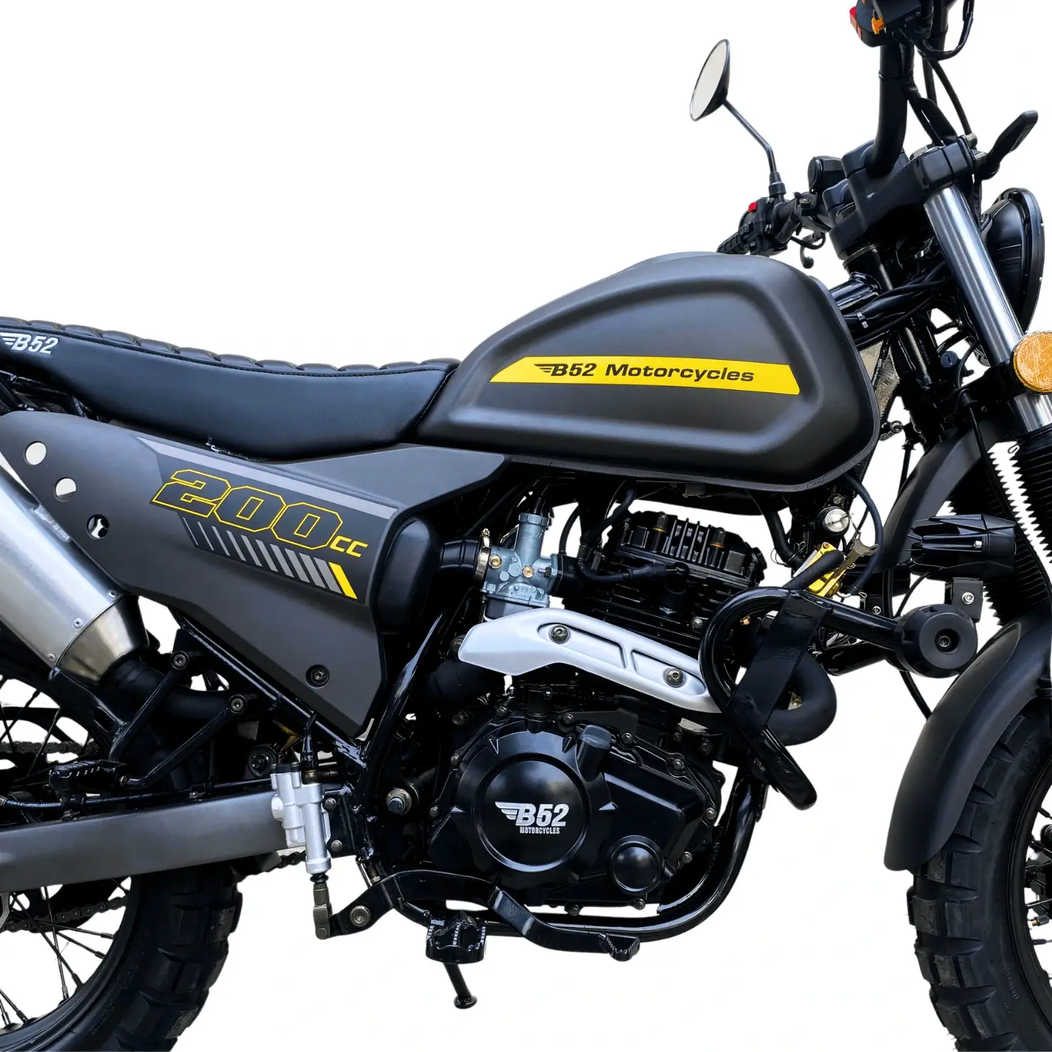 Motor de cadenilla veloz y potente, café racer con detalles cross, ideal para ciudad y terrenos.