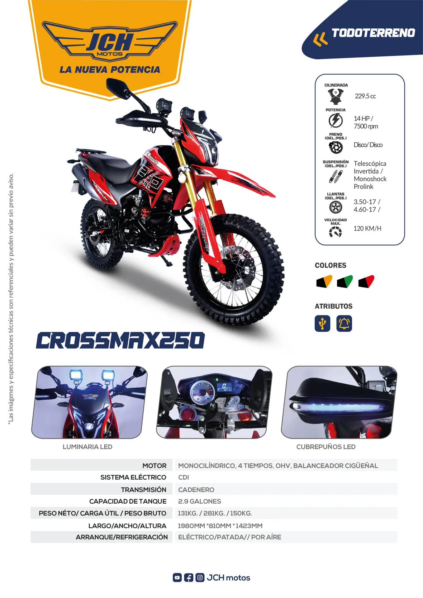 La CROSSMAX 250 PRO es una motocicleta todo terreno con aro 17, cómoda y segura, ideal para rutas urbanas y off-road sin límites.