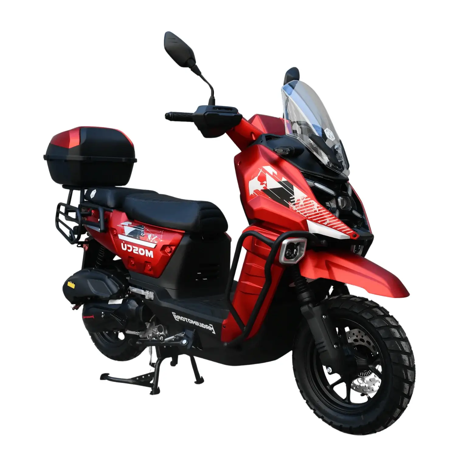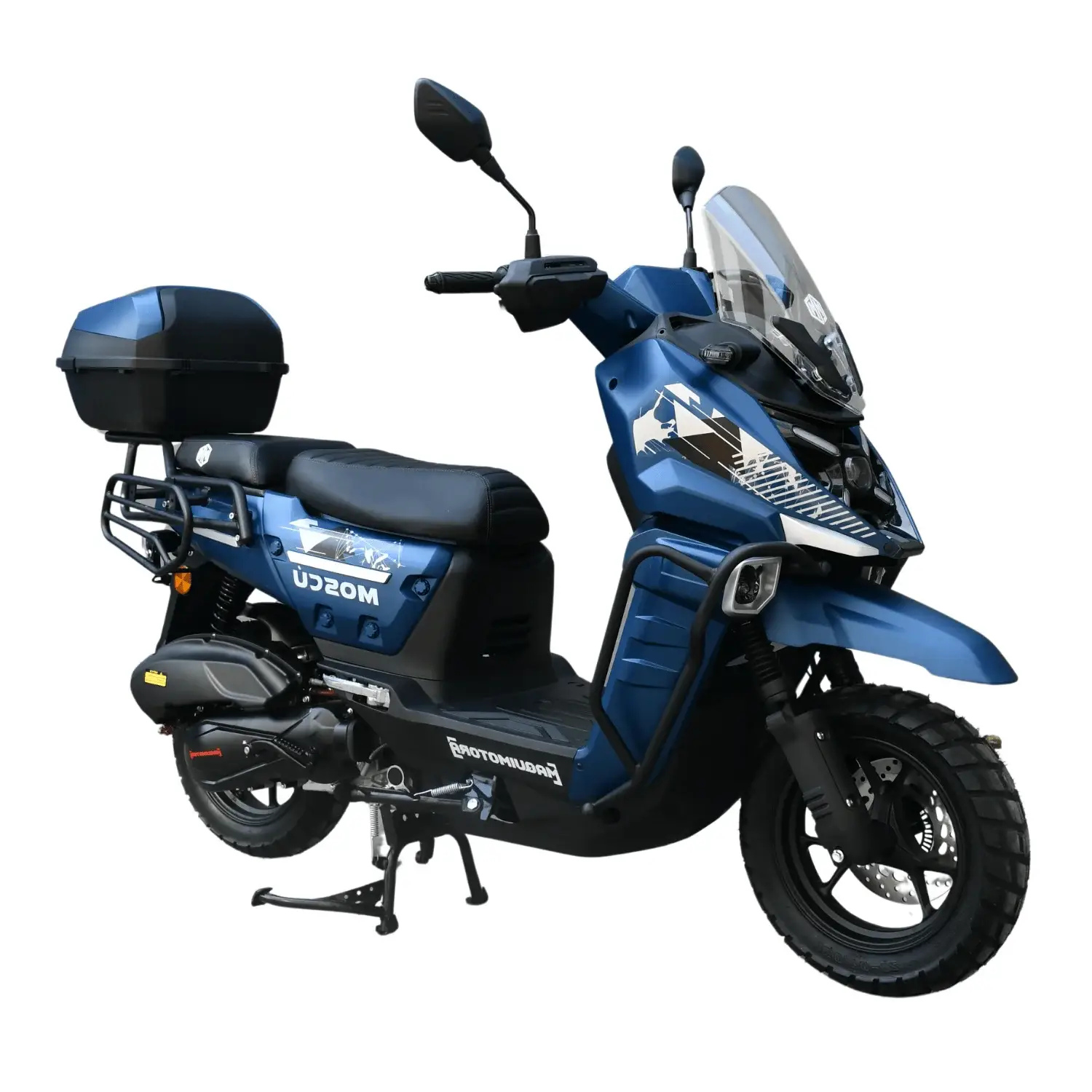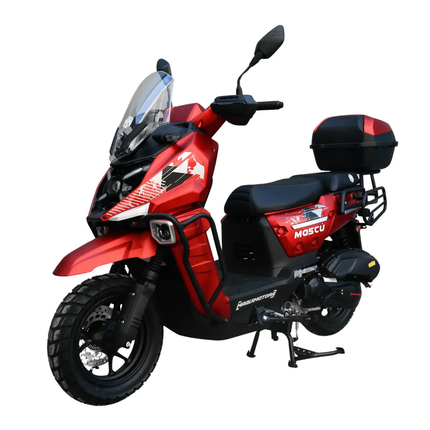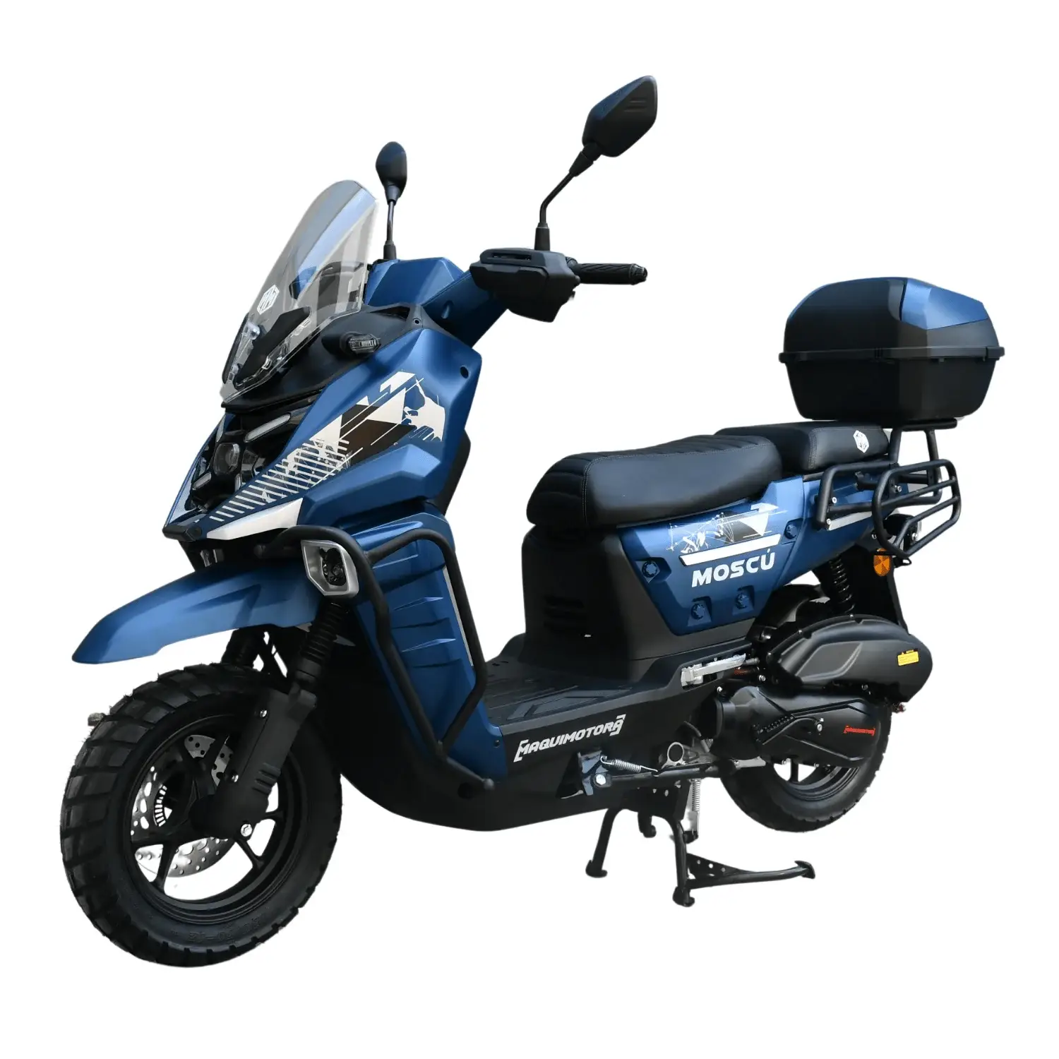 Scooter 150cc automática, eficiente, arranque eléctrico y pedal, frenos mixtos, suspensión cómoda, tanque 6L, Bluetooth, USB, alarma y tablero digital.