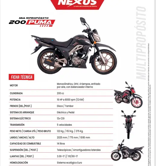 La Nexus 200 Puma es una motocicleta ágil y funcional, ideal para el uso diario en ciudad. Su motor de 200 cc ofrece un buen equilibrio entre rendimiento y eficiencia, mientras que su diseño compacto y cómodo facilita la conducción en el tráfico urbano.