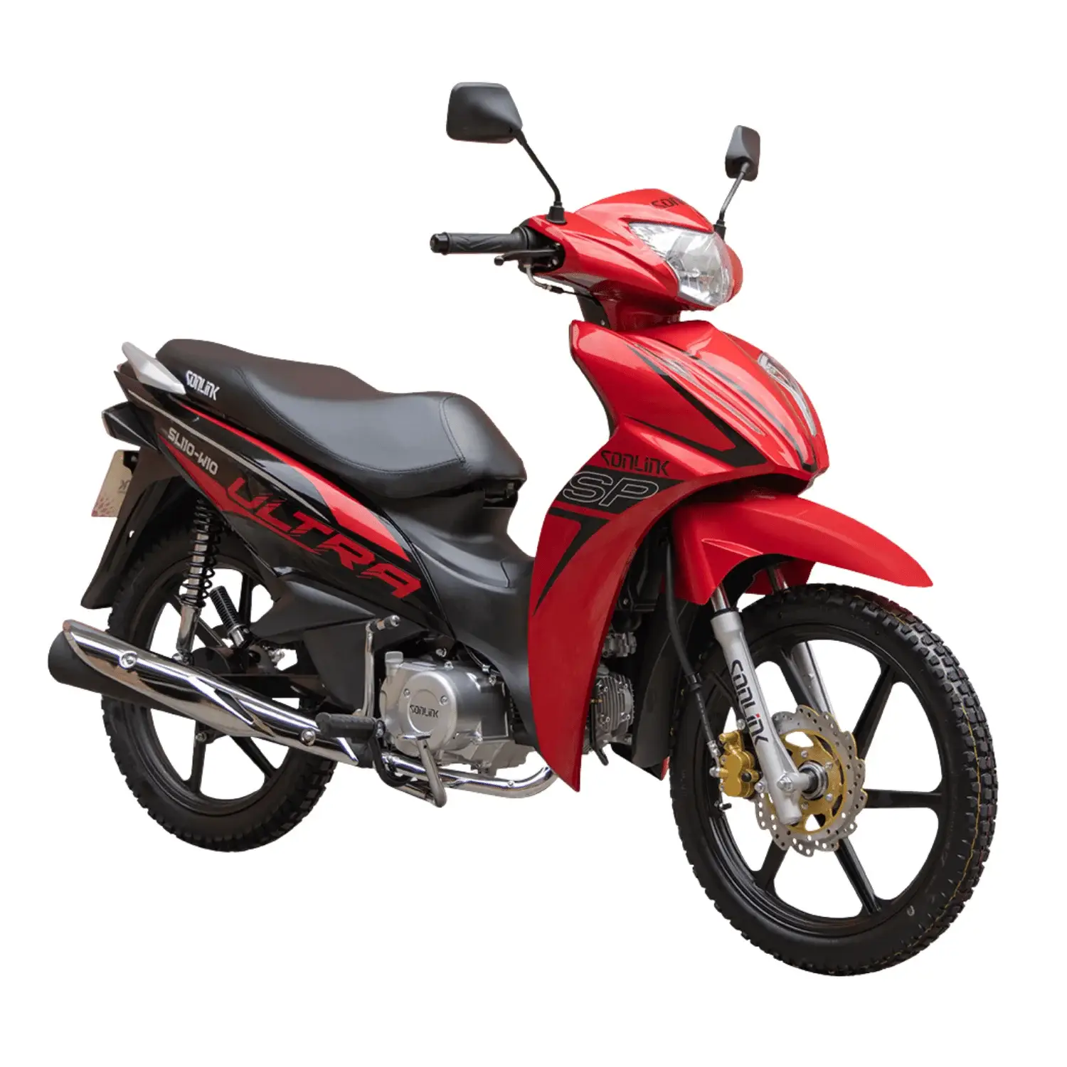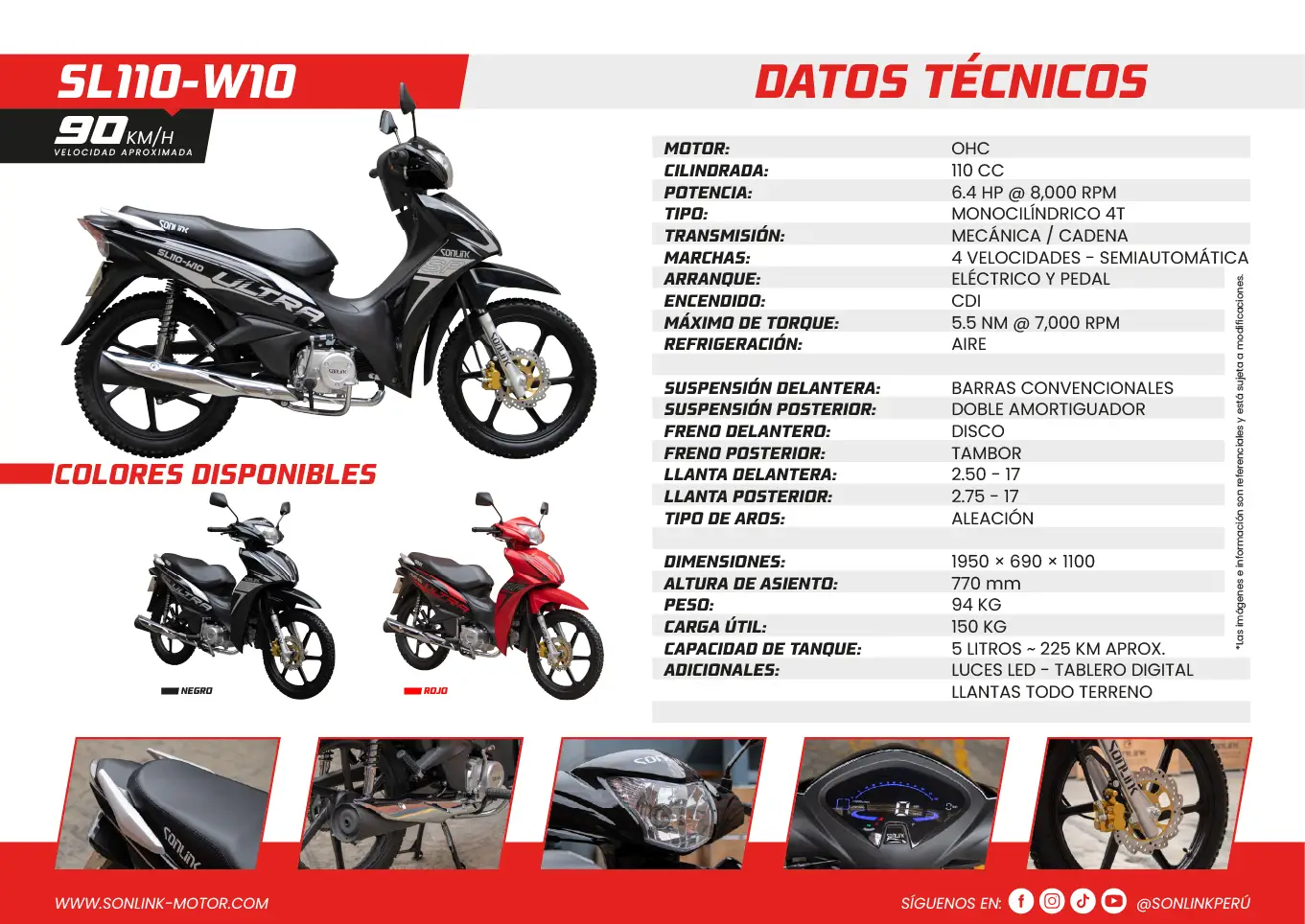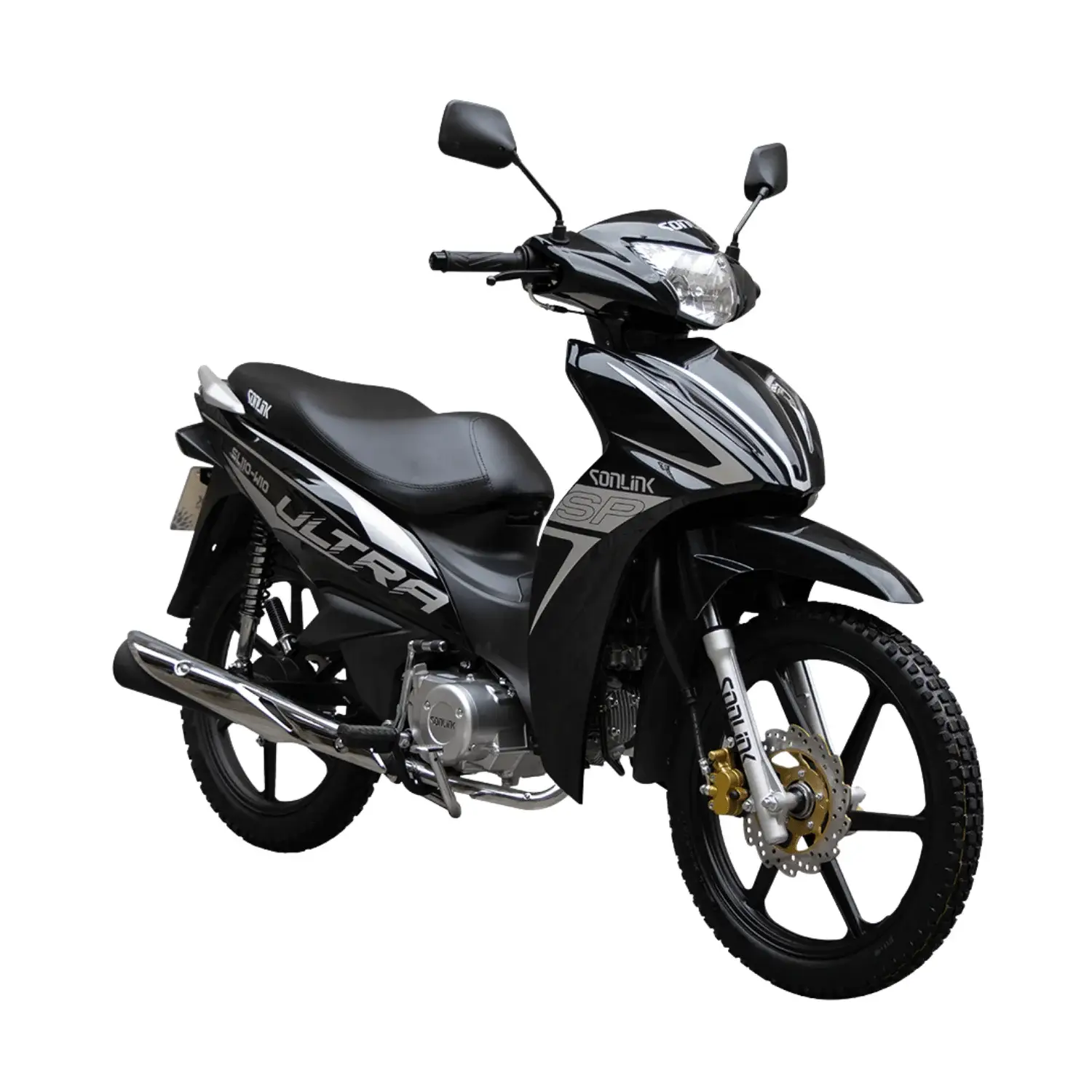 La Sonlink SL110-W10 negra ofrece 110 cc, 6.4 HP, transmisión semiautomática, bajo consumo, diseño elegante, seguridad con freno a disco, ideal para uso urbano diario confiable.