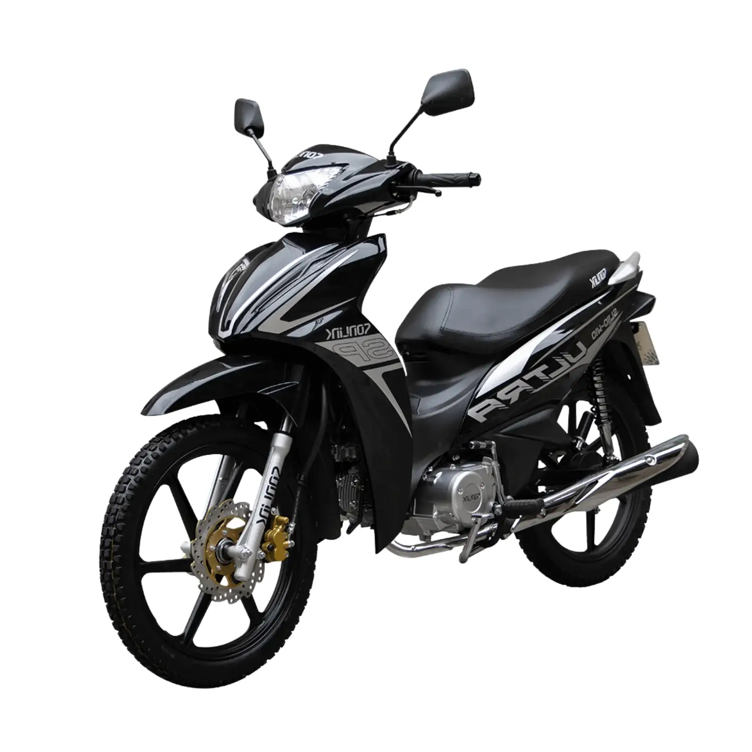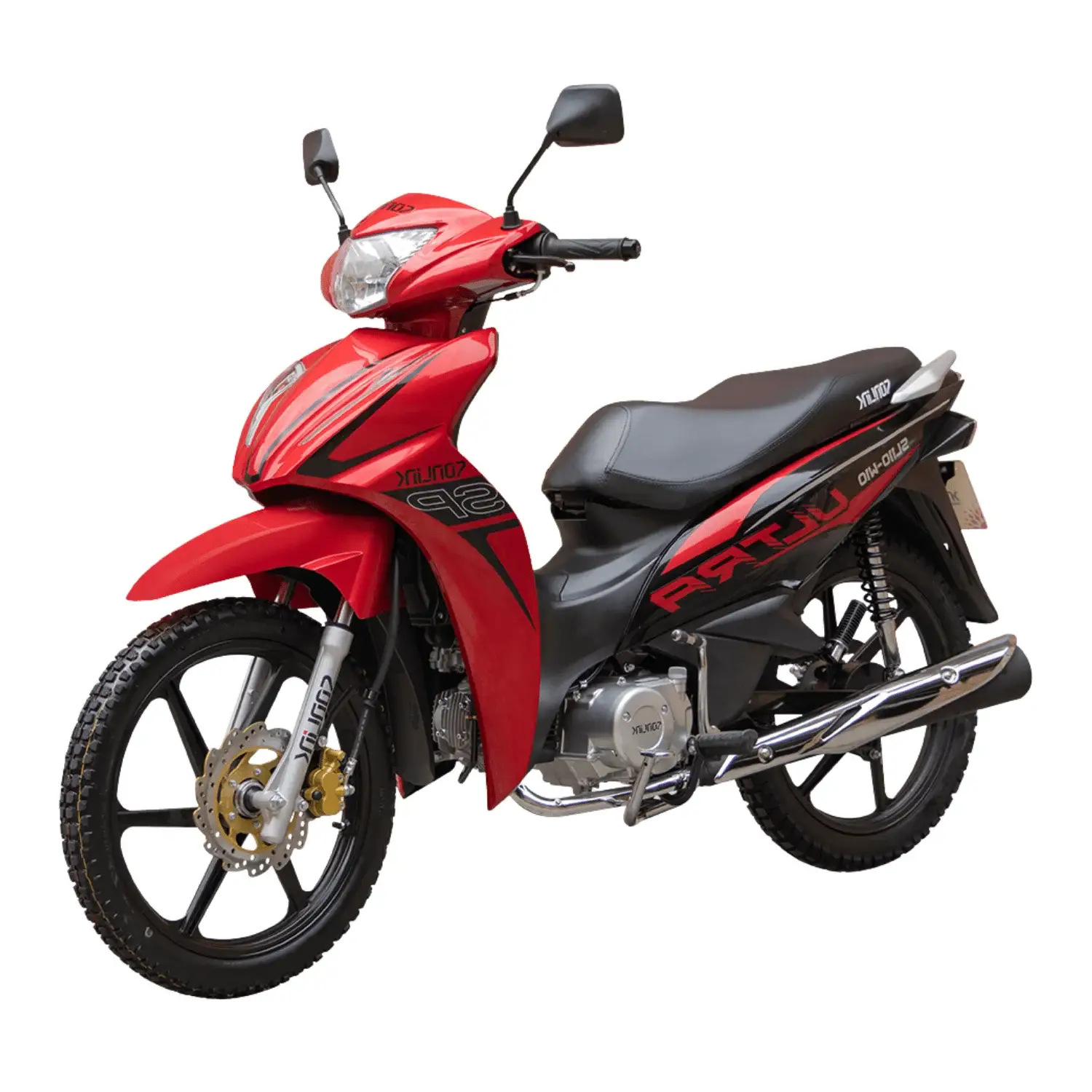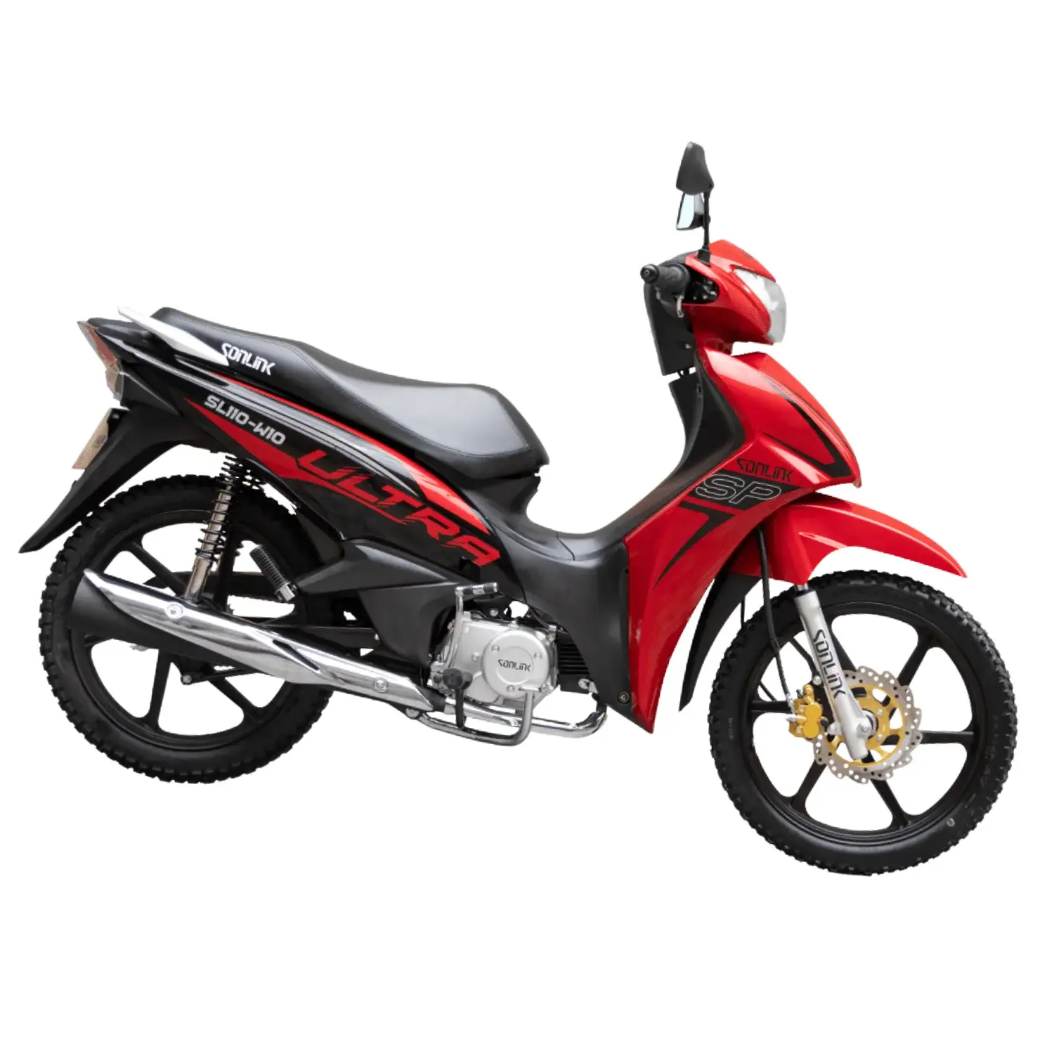 La Sonlink SL110-W10 negra ofrece 110 cc, 6.4 HP, transmisión semiautomática, bajo consumo, diseño elegante, seguridad con freno a disco, ideal para uso urbano diario confiable.
