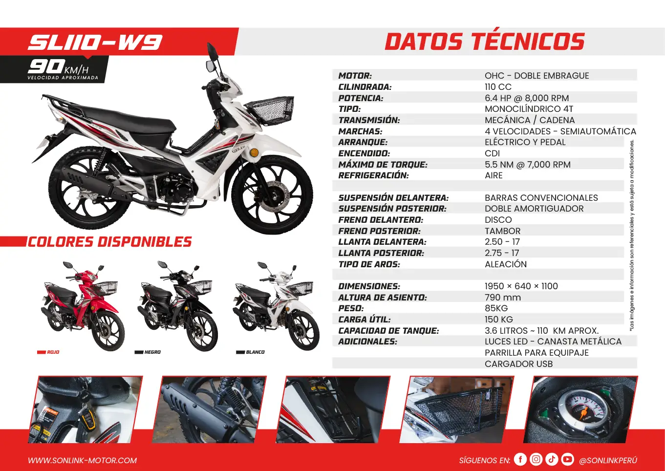 La Sonlink SL110-W9 es una motocicleta urbana semiautomática de 110 cc, ideal para ciudad, económica, ágil, segura y perfecta para uso diario y reparto ligero.