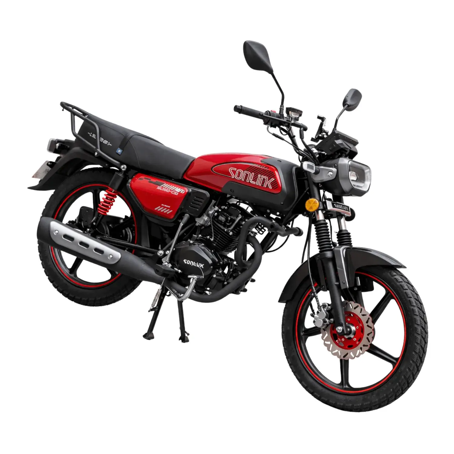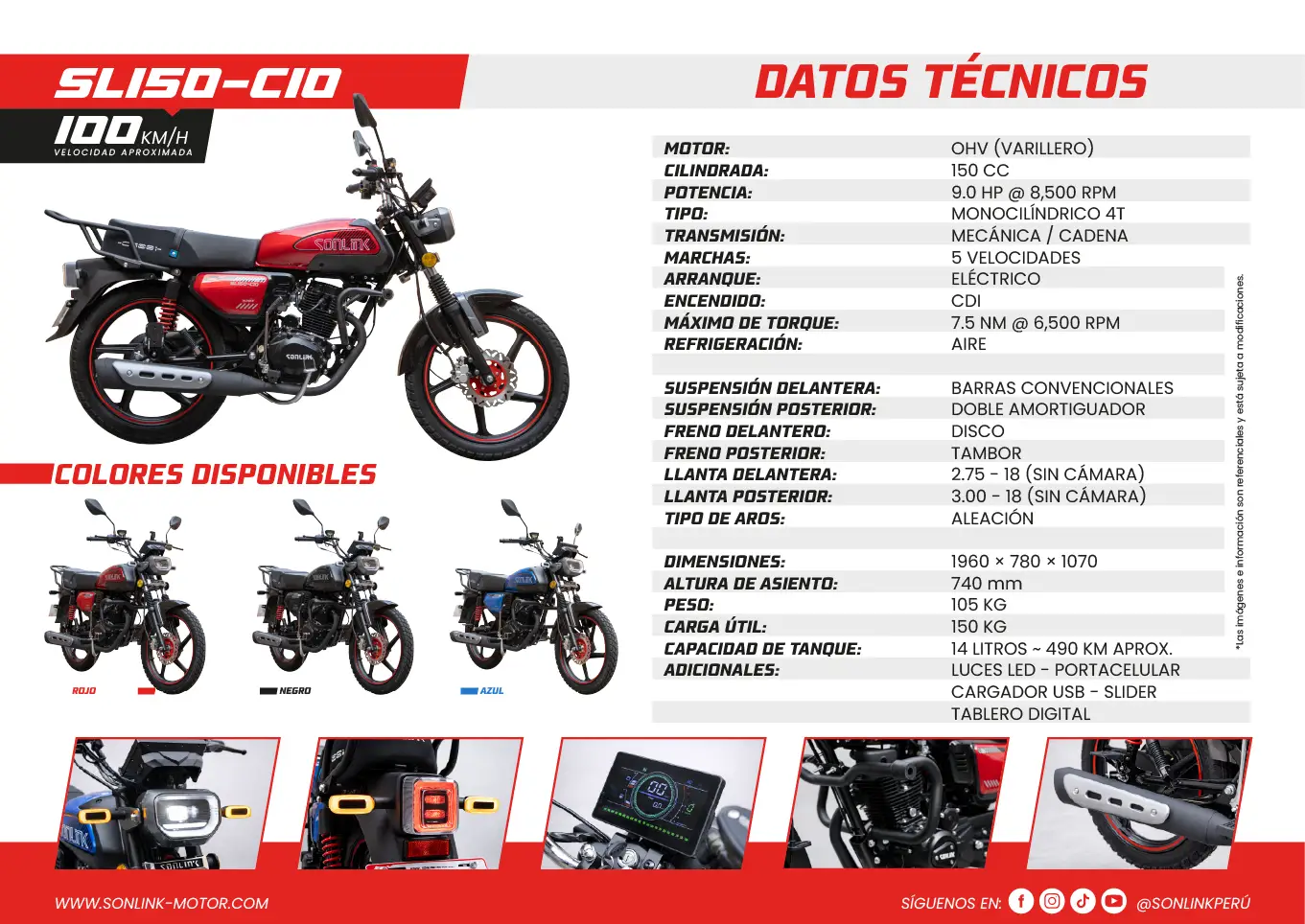 La SONLINK SL150-C10 es una moto urbana de 150 cc con 9 HP, transmisión de 5 velocidades, gran autonomía, diseño moderno, luces LED, tablero digital y extras como USB y portacelular.