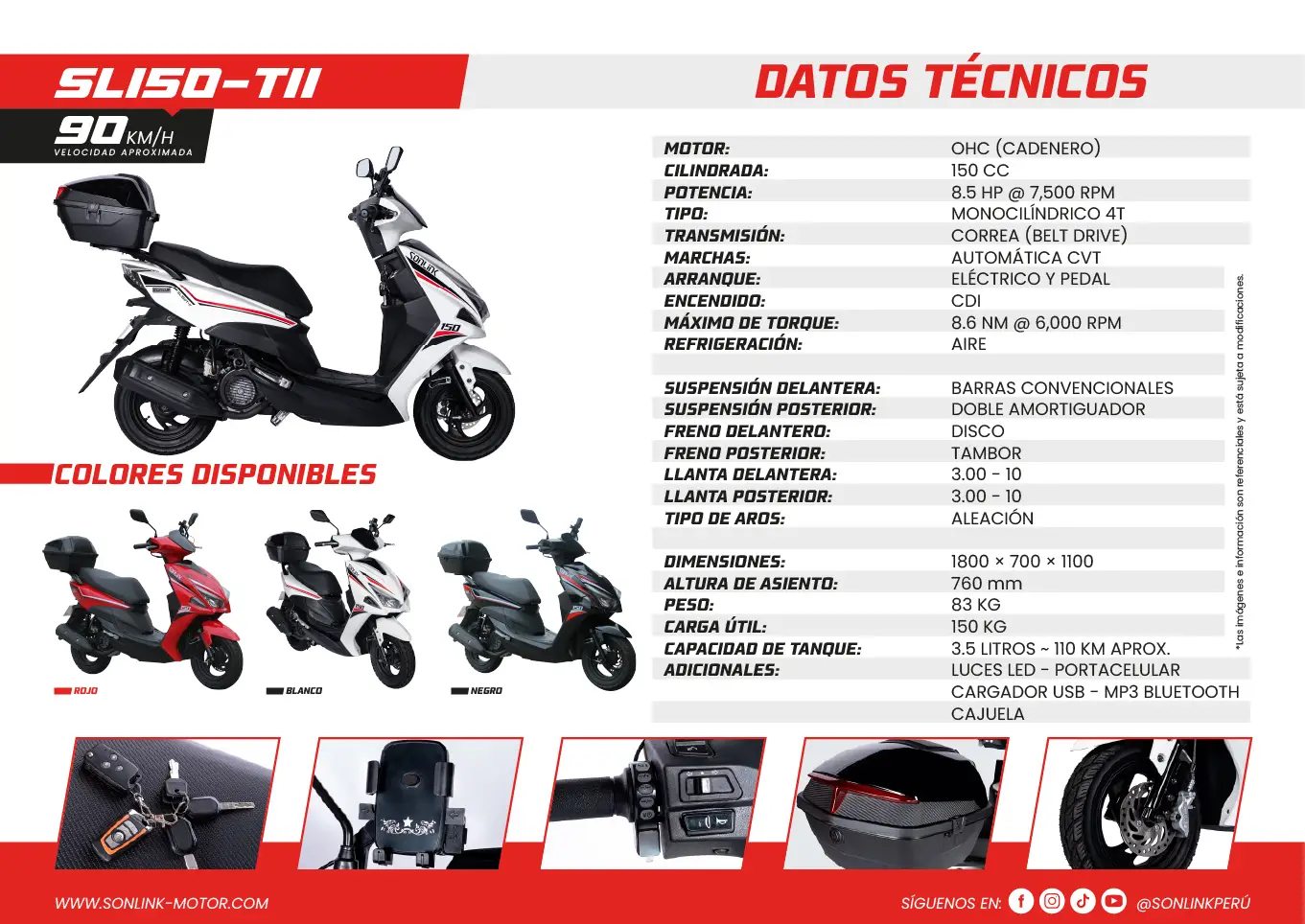 Scooter Sonlink SL150T-11 eficiente, cómoda, compacta, 150cc, maniobrable, luces LED duraderas, ideal para ciudad y tráfico diario.