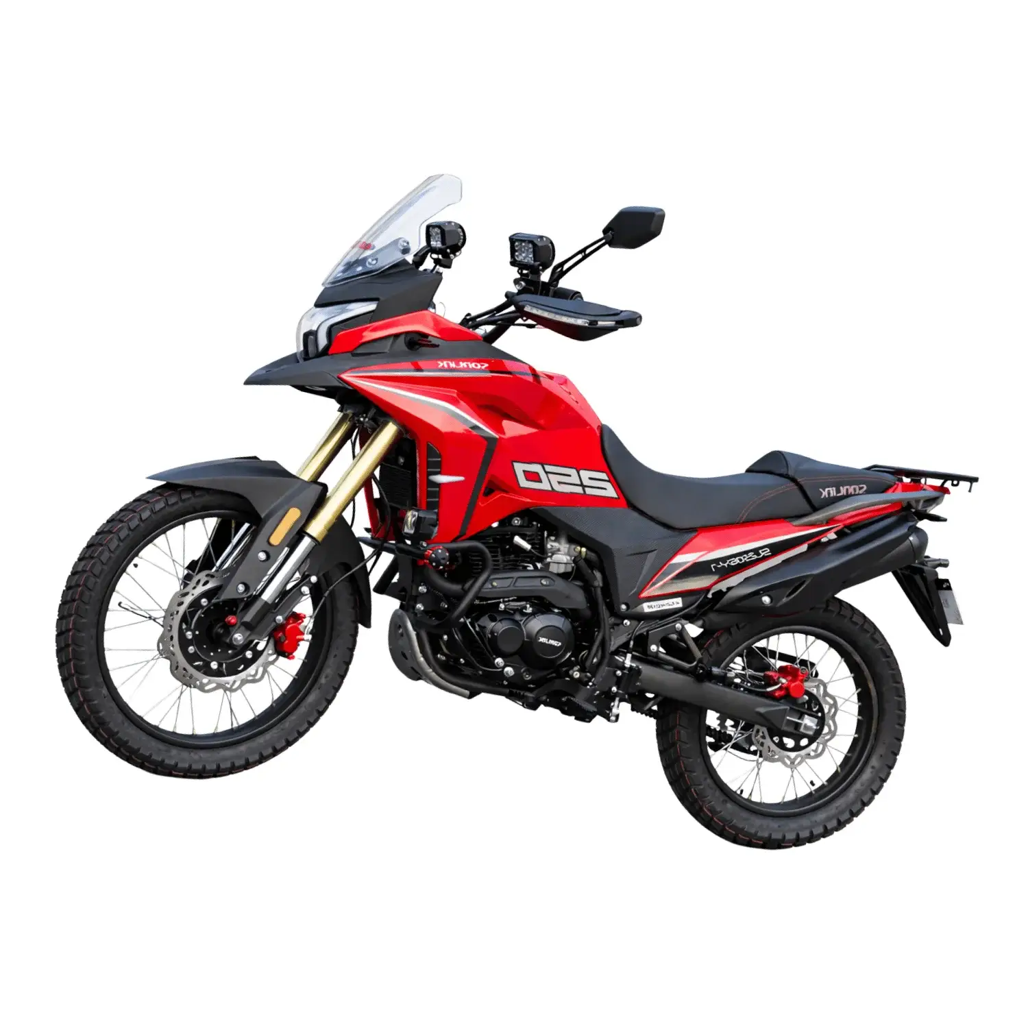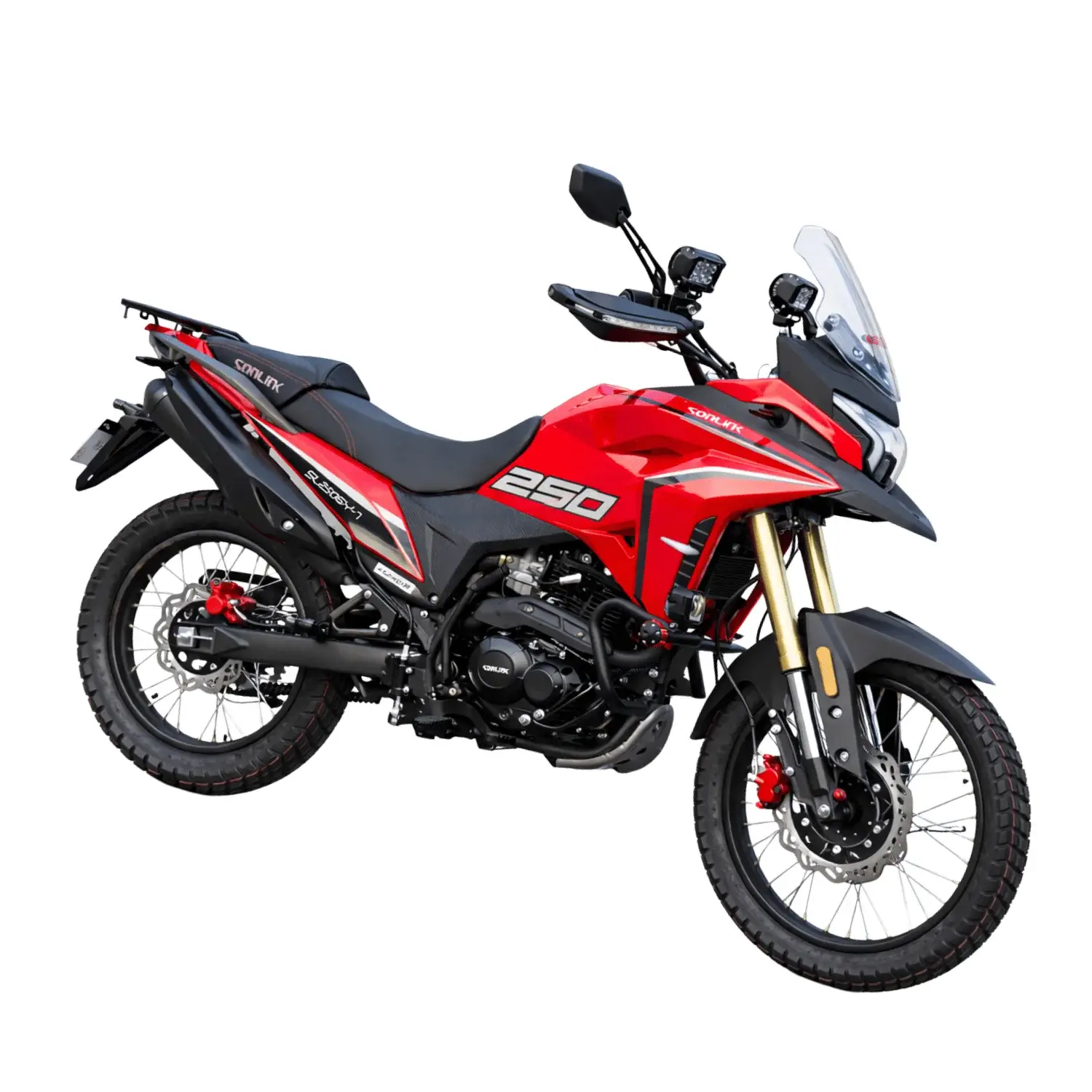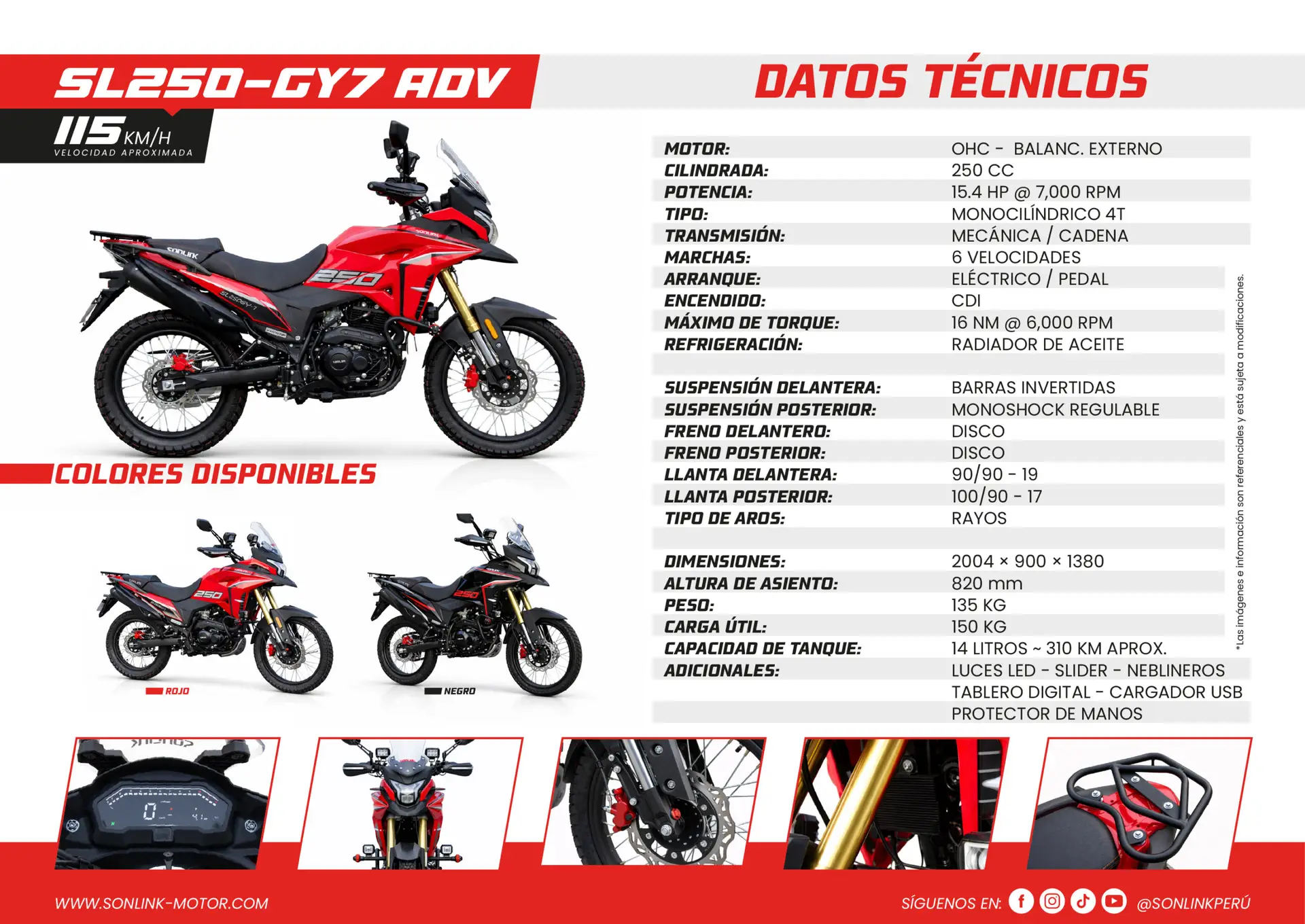 Motocicleta 250cc adventure versátil, motor 15.4 HP, 6 velocidades, suspensión avanzada, frenos disco, tecnología moderna y entrega con placa incluida; ideal para ciudad y aventura.