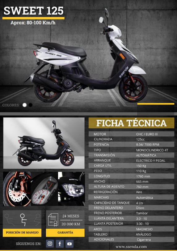 Scooter compacta con diseño original y práctico. Su motor de 125 cc ofrece bajo consumo y excelente maniobrabilidad, ideal para ciudad. Destaca por su frontal distintivo y comodidad en el manejo diario.